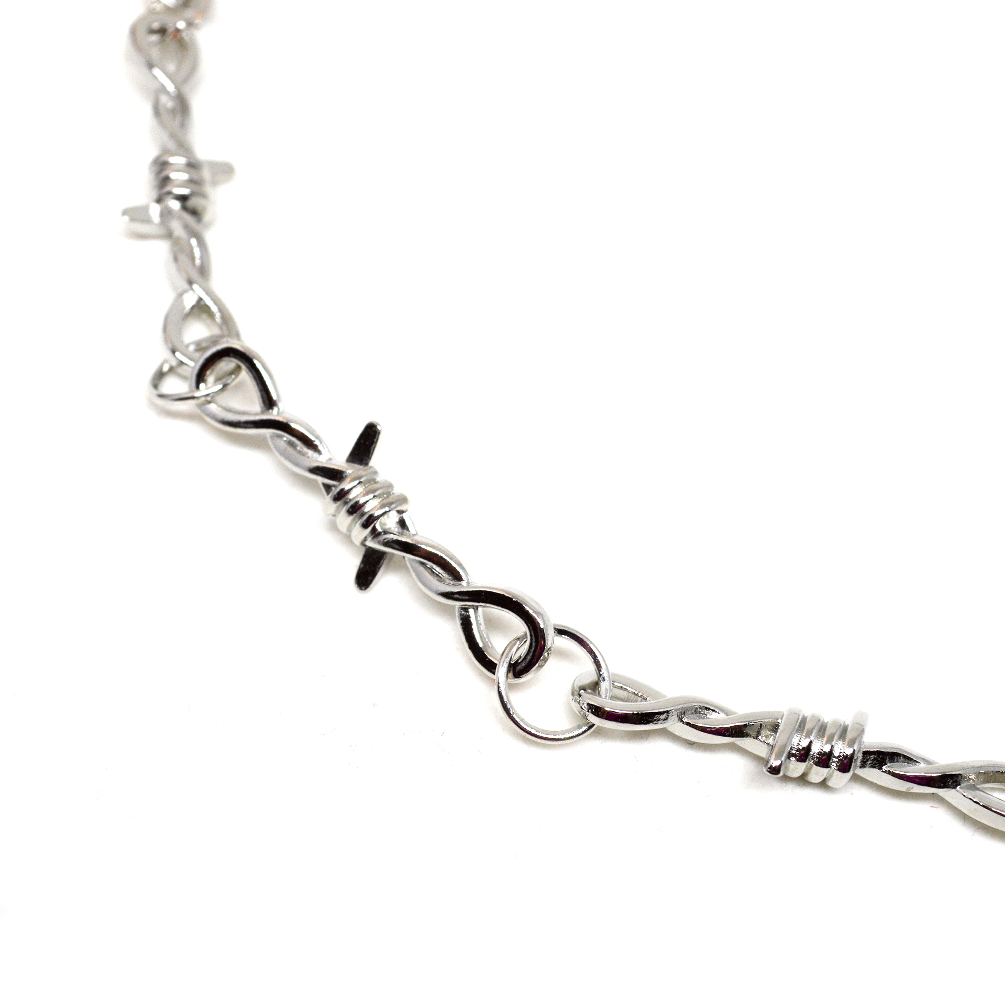 This punk barbed wire necklace features the edgy look of twisted wire in silver toned, while linking around your necklace in lightweight, comfortable fashion that does not poke your skin.