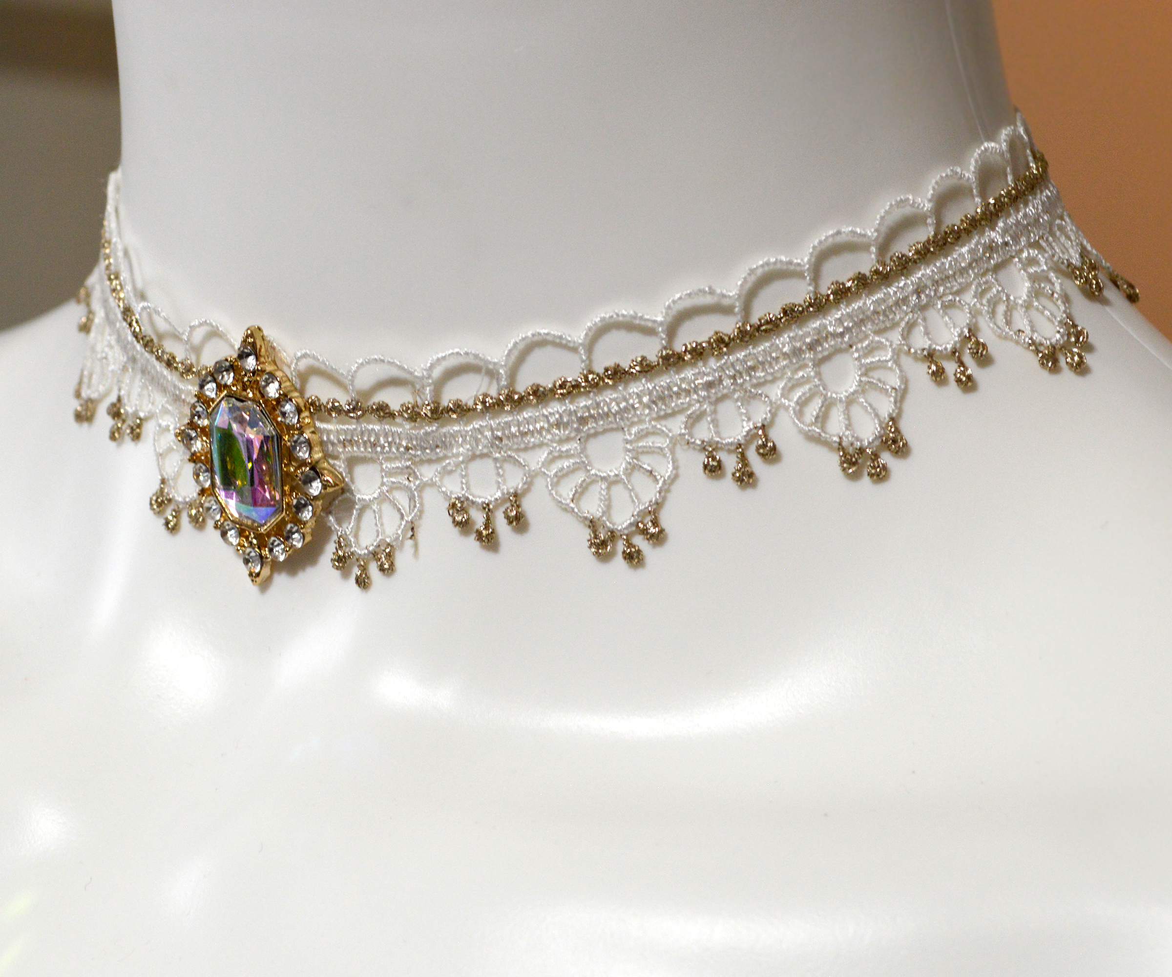 - Color: White and gold lace with iridescent opal rhinestone