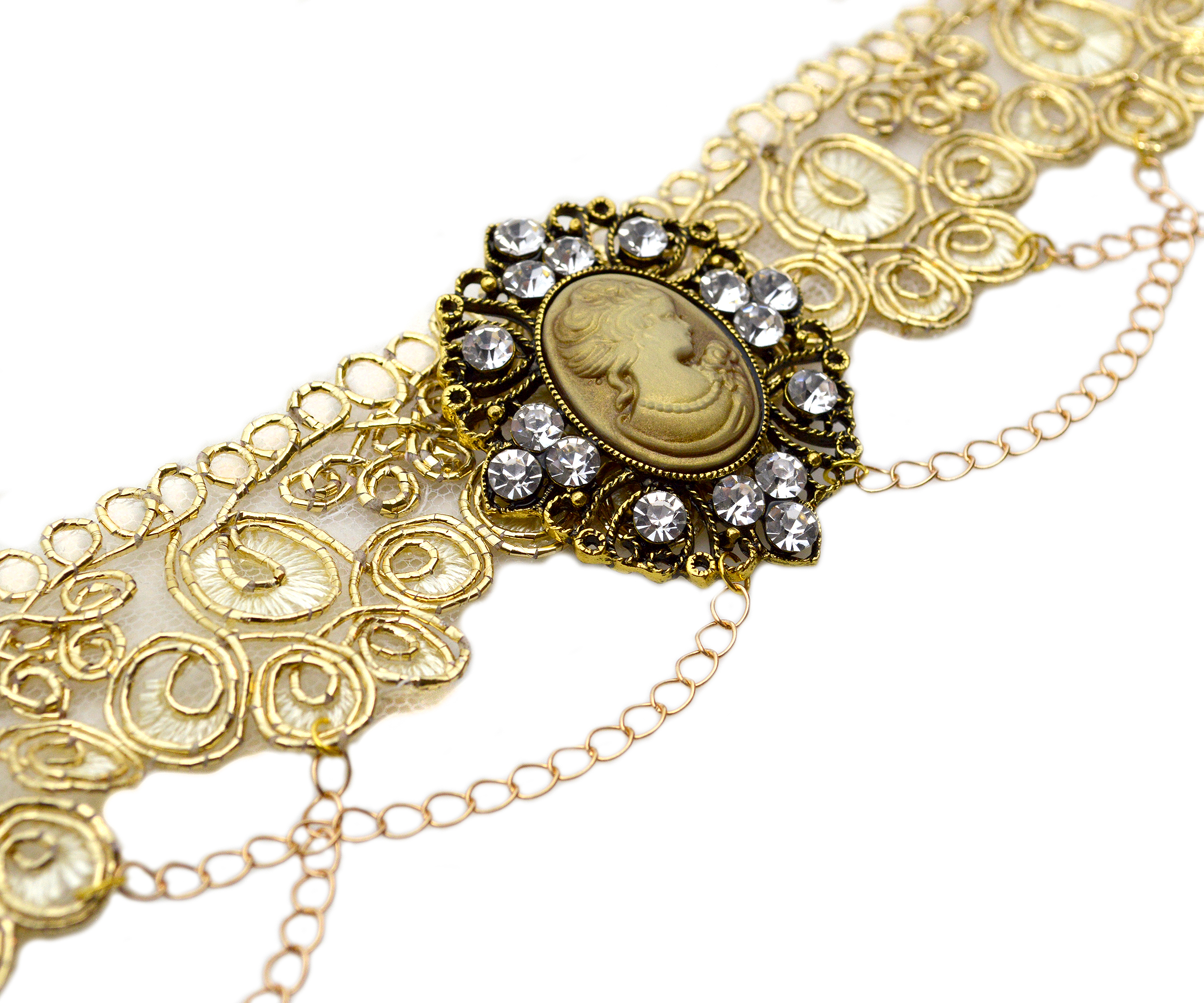 Indulge in vintage opulence with this shiny golden lace choker, a radiant blend of regal elegance and timeless romance. Featuring a striking sienna-colored cameo framed in a rhinestone-studded setting, this piece captures the glow of candlelit ballrooms and the charm of heirloom treasures.
