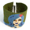 Woven out of thousands of tiny, uniform beads, this bracelet depicts a lovely portrait of a blue-haired mermaid, against the green depths of the ocean forest.