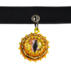 This yellow and orange butterfly choker contains a radiant dragon eye glass pendant dangling from the center of it’s burnished, black leather collar. This uncommon piece of exquisite fashion jewelry excites with its intricately detailed design of bright yellow and orange shades of glass beads that surround a fantastically digitally rendered dragon iris. Combine this fantasy choker with it’s matching set of earrings for a complete, dream-inducing look.