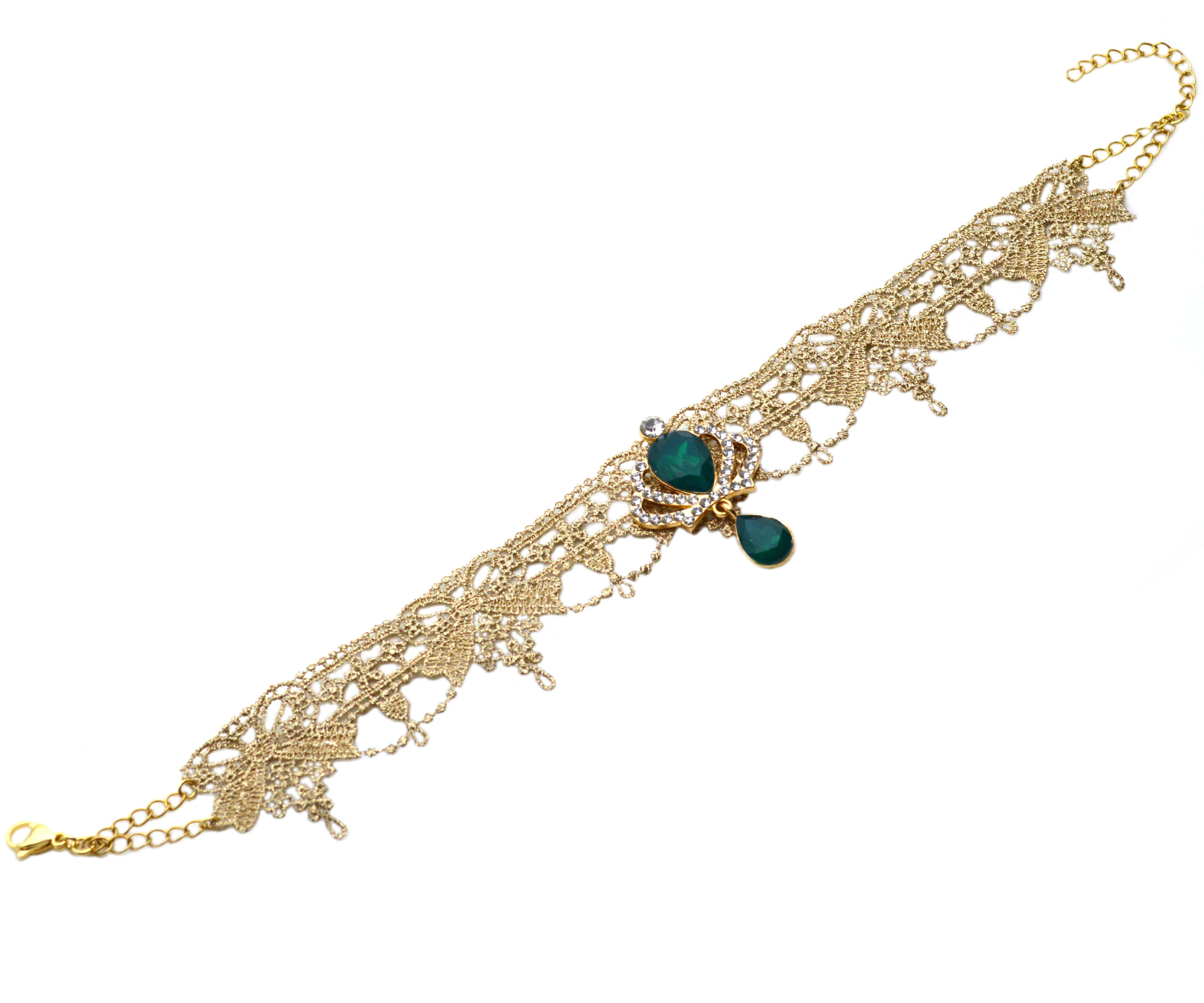 Fit for a modern-day queen, this gold lace choker is a dreamy blend of delicate elegance and royal flair. Intricately woven with dainty bow patterns, the lace adds a soft, feminine charm—while the centerpiece steals the show: a green and clear rhinestone cabochon, shaped like a tiny vintage crown, sparkling with regal brilliance.