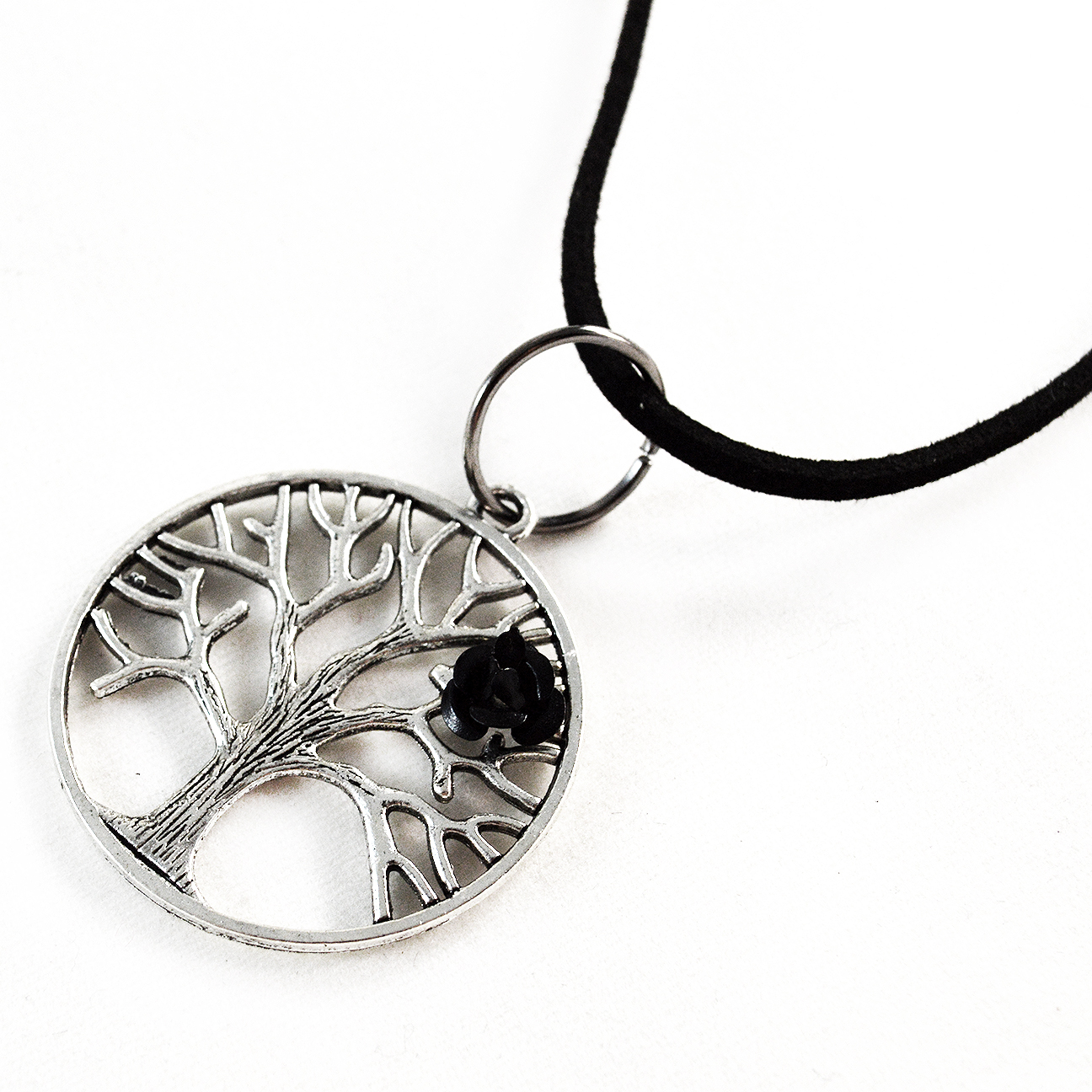 The intricately detailed tree charm is decorated with a single black metal rose on its branches. The rose matches the suede necklace, tying the whole piece together.